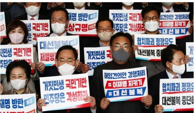 이어 "민주당은 명분 없는 해임 건의안에 혈안이 돼 국회 예산을 통째로 쓰레기통에 버렸다"며 "이재명 대표와 민주당은 자수해서 광명 찾기를 바란다. 민주당은 의인 1명이 없어서 반드시 망할 것"이라고 비난했다.