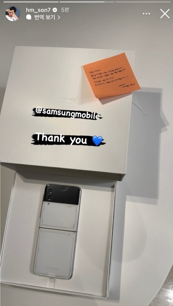 손흥민은 인스타그램에 선물 받은 스마트폰 사진과 함께 삼성전자의 공식 인스타그램을 태그했다. 여기에 “땡큐(Thank you)”라는 메시지도 덧붙였다.