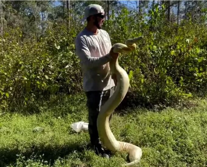USA투데이 지난 12일(현지시간) 보도에 따르면 미국 플로리다주 남서부 네이플스의 한 주택가에서 신고를 받고 출동한 뱀 전문 사육사가 대형 알비노 보아뱀을 포획했다.