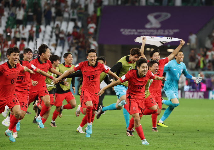 지난 3일 오전(한국시간) 카타르 알라이얀의 에듀케이션 시티 스타디움에서 열린 2022 카타르 월드컵 조별리그 H조 3차전 대한민국과 포르투갈 경기에서 승리를 거두며 16강 진출에 성공한 대표팀이 기뻐하며 그라운드를 달리고 있는 모습. 연합뉴스