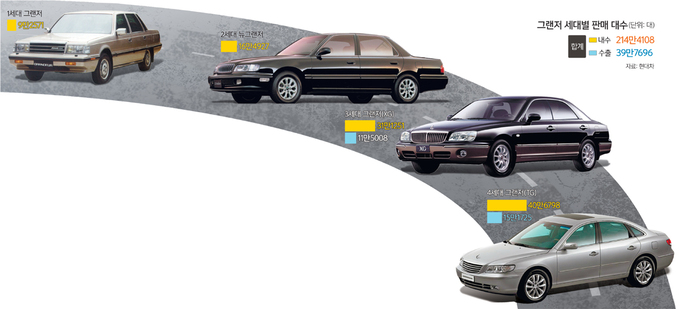 올해 서른여섯 살이 된 그랜저 앞에 붙는 다양한 수식어다. ‘성공’을 상징하는 이미지로 국내 고급 세단 시장을 선도해온 현대자동차의 그랜저가 최근 7세대인 ‘디 올 뉴 그랜저’로 새로운 역사를 쓰고 있다. 1986년 1세대 모델 출시 이후 국내 대표 준대형 세단으로 자리매김한 그랜저는 1992년 ‘뉴 그랜저’, 1998년 ‘그랜저(XG)’, 2005년 ‘그랜저(TG)’, 2011년 ‘그랜저(HG)’, 2016년 ‘신형 그랜저(IG)’를 거치며 진화를 거듭해왔다.
