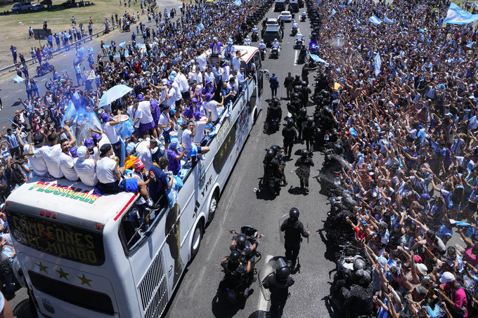 리오넬 메시(35·리오넬 메시)를 비롯한 아르헨티나 축구 대표팀은 이날 귀국후 공항부터 부에노스아이레스까지 2층 버스에 탑승한 채 퍼레이드를 진행했다.