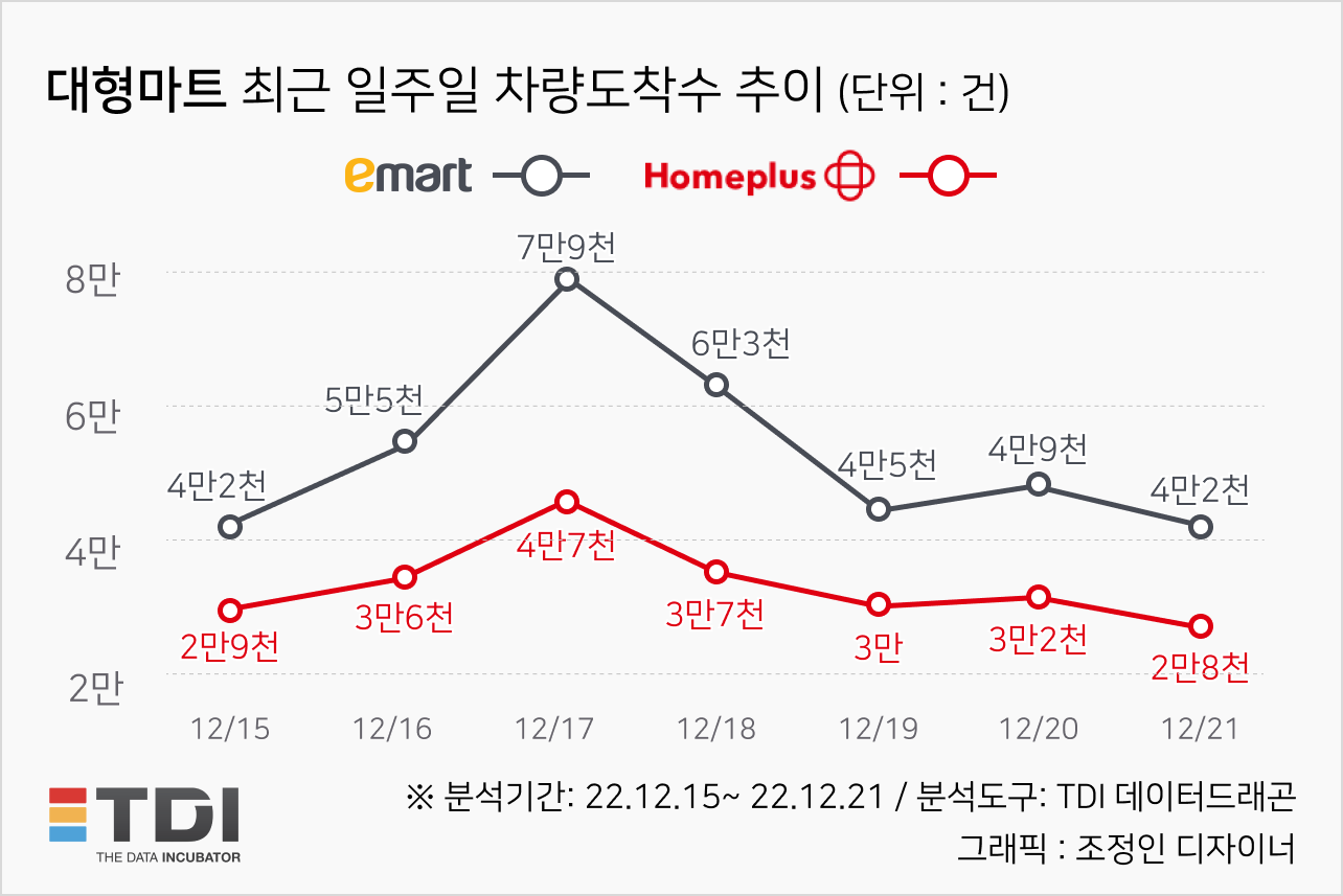빅데이터 전문기업 TDI(티디아이, 대표 이승주)의 분석 플랫폼 데이터드래곤을 통해 대형마트와 백화점 최근 12월 15일부터 21일까지 일주일 간 차량도착수를 분석했다.