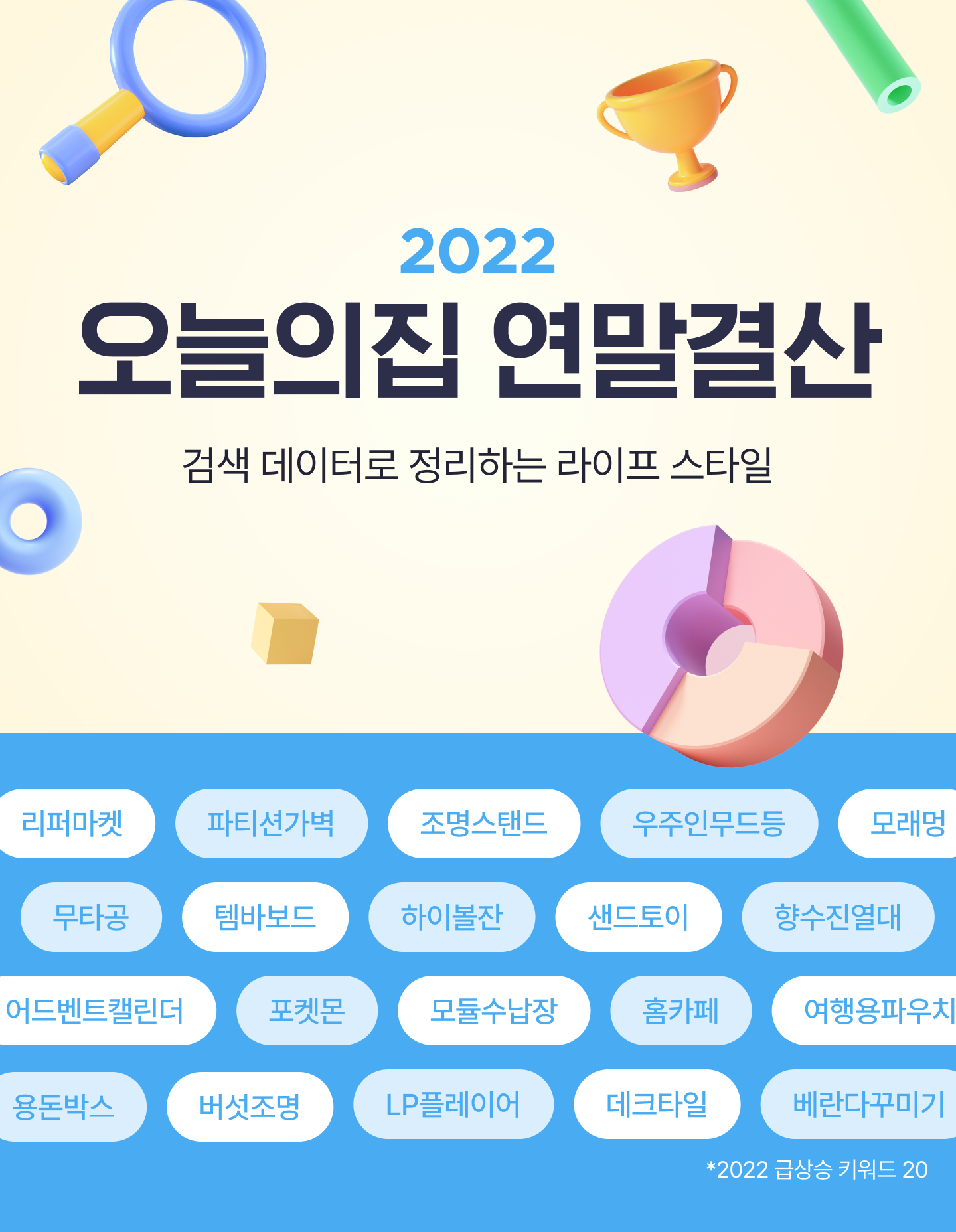 1월에는 ‘강아지한복’이 인기 검색어에 올랐는데 이는 전체가구의 30%에 가까운 600만가구가 반려동물을 키우는 국내 트렌드를 반영한 결과로 해석된다. 2월엔 서울 북촌과 익선동에 레트로 LP카페가 주목받으며 오늘의집 검색에서도 ‘LP’가 인기 검색어를 차지했다. 본격적인 위드코로나 시작에 따라 야외활동과 관련된 라이프스타일 키워드도 인기검색어에 이름을 올렸다. 4월엔 ‘피크닉 바구니’가 주목받았고, 7월엔 양산과 우산을 겸한 ‘양우산', 9월에는 ‘캠핑’관련 검색어가 인기를 끌었다.