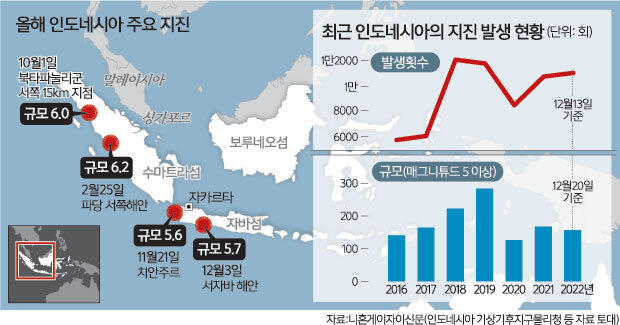 신문은 인도네시아 기상기후지구물리청, 중앙통계국 자료를 인용해 “지진 횟수는 최근 5년간 2배 수준으로 증가했다”고 전했다. 미국 지질조사센터에 따르면 올해 인도네시아에서 발생한 규모5 이상의 지진은 이틀에 한 번꼴인 156번(12월20일 기준)이나 발생했다.
