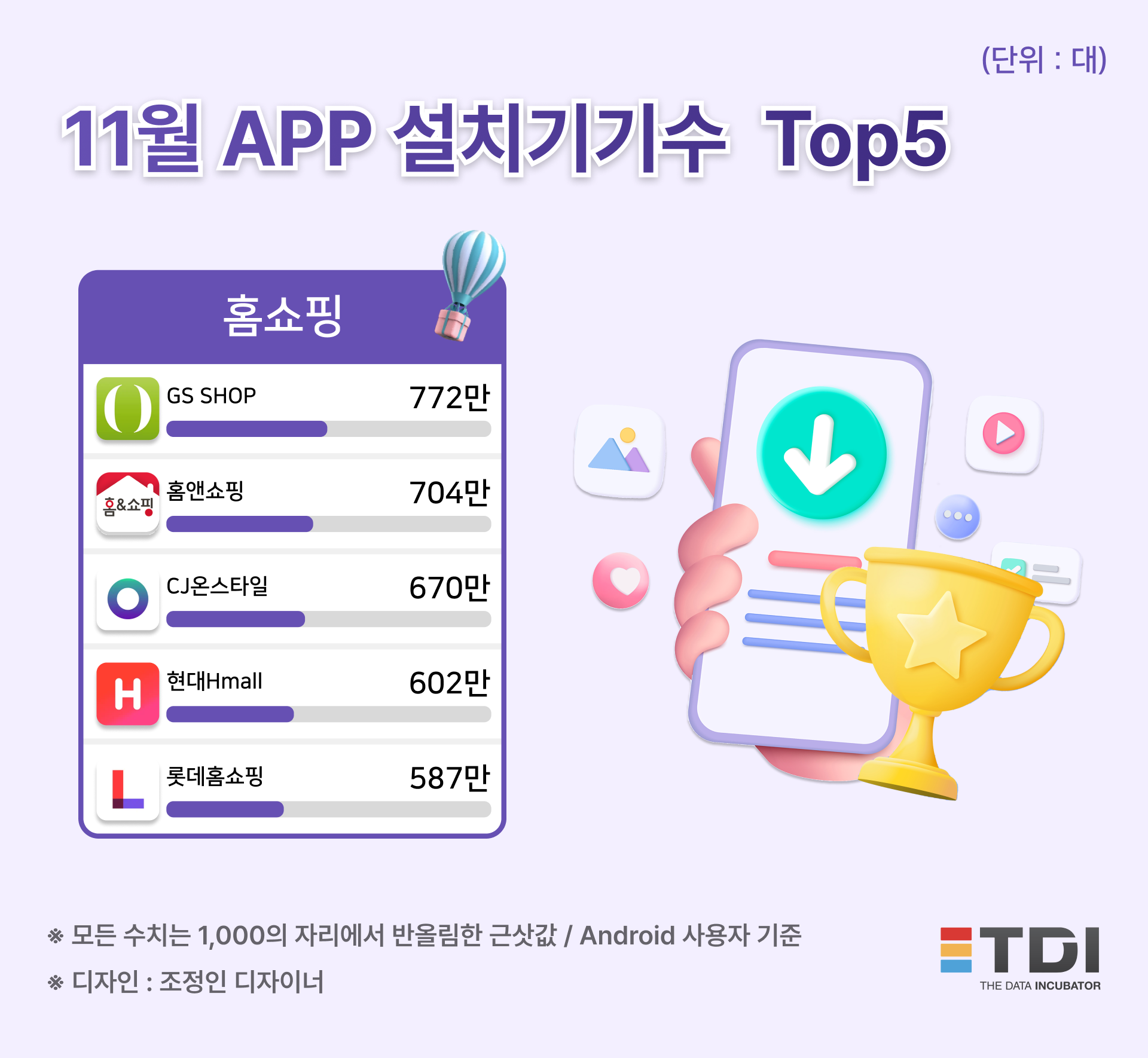 빅데이터 전문기업 TDI(티디아이, 대표 이승주)가 데이터드래곤을 통해 10월 기준 안드로이드 사용자를 분석한 결과 설치자가 가장 많은 앱은 ▲GS SHOP ▲홈앤쇼핑 ▲CJ온스타일 ▲현대Hmall ▲롯데홈쇼핑 순이다.