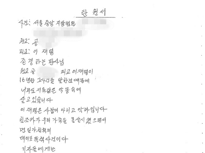 30일 유족 측 법률 대리인인 법무법인 ‘찬종’의 이병철 변호사에 따르면 원고는 최근 서울중앙지법에 제출한 A4용지 두 페이지 분량의 탄원서에서 “피고 이재명이 16년 전 그 사건을 말한 것 때문에 너무도 지옥 같은 악몽 속에 살고 있다”고 호소했다. 이어 “이재명은 사람이 아니고 악마”라며 “(자신의) 친조카가 우리 가족을 몰살시켰으면서 먼 일가 친척의 데이트 폭력 사건이다(라고 말하고) 기자들에게는 변호사라서 변호했지 뭐가 잘못됐냐(며) 그 질문 그만해라(는 식으로 말하고 있다)”고 주장했다.