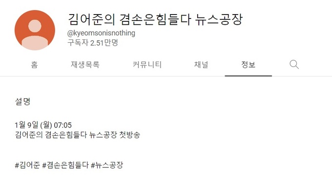 이날 방송계 등에 따르면 유튜브에서 ‘김어준의 겸손은힘들다 뉴스공장’으로 검색하면 나오는 채널의 구독자가 오후 4시30분을 기준으로 2만5000명을 넘겼다. 김어준씨는 내년 1월9일 평소 ‘뉴스공장’ 방송 시간보다 살짝 늦은 오전 7시5분에 이 채널에서 첫 방송을 진행할 것으로 전해졌다.