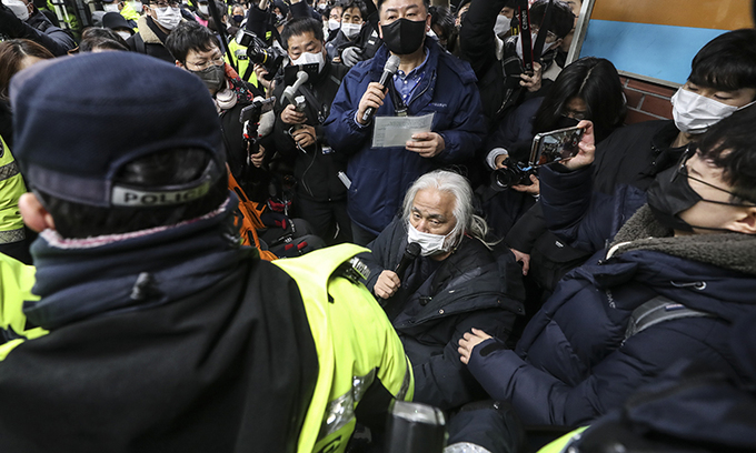이어 헌화를 하던 오후 8시20분께 삼각지역에 열차가 정차하며 스크린도어가 열리자 순간적으로 전장연 활동가들이 진입을 시도해, 경찰 기동대원과 지하철 보안관들이 급히 몸으로 막아서는 위태로운 모습도 나타났다.