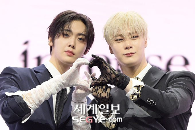 그룹 아스트로 산하(사진 왼쪽)와 문빈이 4일 오후 서울 광진구 광장동 예스24 라이브홀에서 열린 세 번째 미니앨범 '인센스'(INCENSE)의 발매 기념 쇼케이스에 참석해 포즈를 취하고 있다.