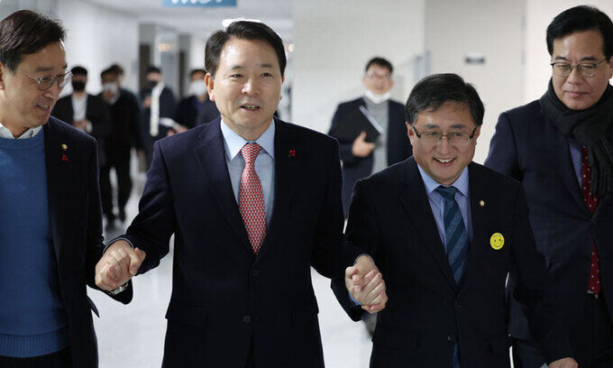국민의힘 성일종(왼쪽), 더불어민주당 김성환 정책위의장 등이 4일 서울 여의도 국회 의원회관에서 정부조직법 개정안 등 논의를 위한 ‘3+3 정책 협의회’에 참석하기 위해 손을 잡고 나란히 걷고 있다. 허정호 선임기자