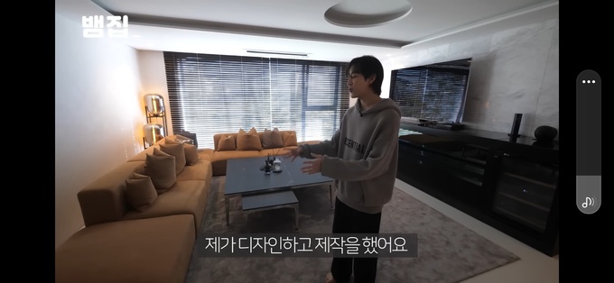 뱀뱀은 해당 영상에서 넓은 거실과 고급스러워 보이는 가구와 오브제가 배치된 집 곳곳을 소개했다. 뱀뱀은 거실을 소개하면서 큰 소파가 자리한 것에 대해 “친구들과 편하게 앉을 수 있게 제가 디자인하고 제작했다”고 설명했다.