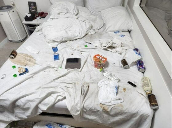 사진 속 객실 침대는 까만 얼룩이 가득했고, 침대 위에는 다 피운 담뱃갑과 음료수 등 각종 쓰레기가 널브러져 있었다.