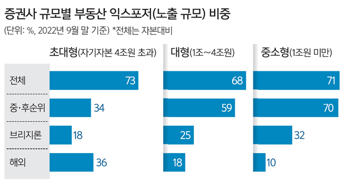 브랜드 파워가 초대형사에 비해 약한 중소형 증권사들은 중·후순위 PF, 브리지론 등 고금리, 고위험 대출에 뛰어들어 사업 중단이나 미분양에 따른 피해가 클 수밖에 없다. 나이스신용평가가 지난해 9월 말 국내 24개 증권사를 조사한 결과 자기자본 1조원 미만 중소 증권사의 부동산 브리지론 비중은 32.1%로 자기자본 4조원 초과 초대형사(18.4%)와 비교해 2배 가까이 높았다. 상대적으로 변제 순서가 밀리는 중·후순위 본 PF의 경우 중소 증권사에서 비중이 70.4%로 초대형사(33.8%)를 웃돌았다.