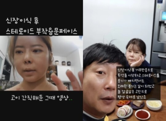 개그맨 이수근(오른쪽 사진 왼쪽)의 아내 박지연(왼쪽 사진)이 신장 이식 수술 후 심각한 스테로이드 부작용을 겪었다고 고백했다.