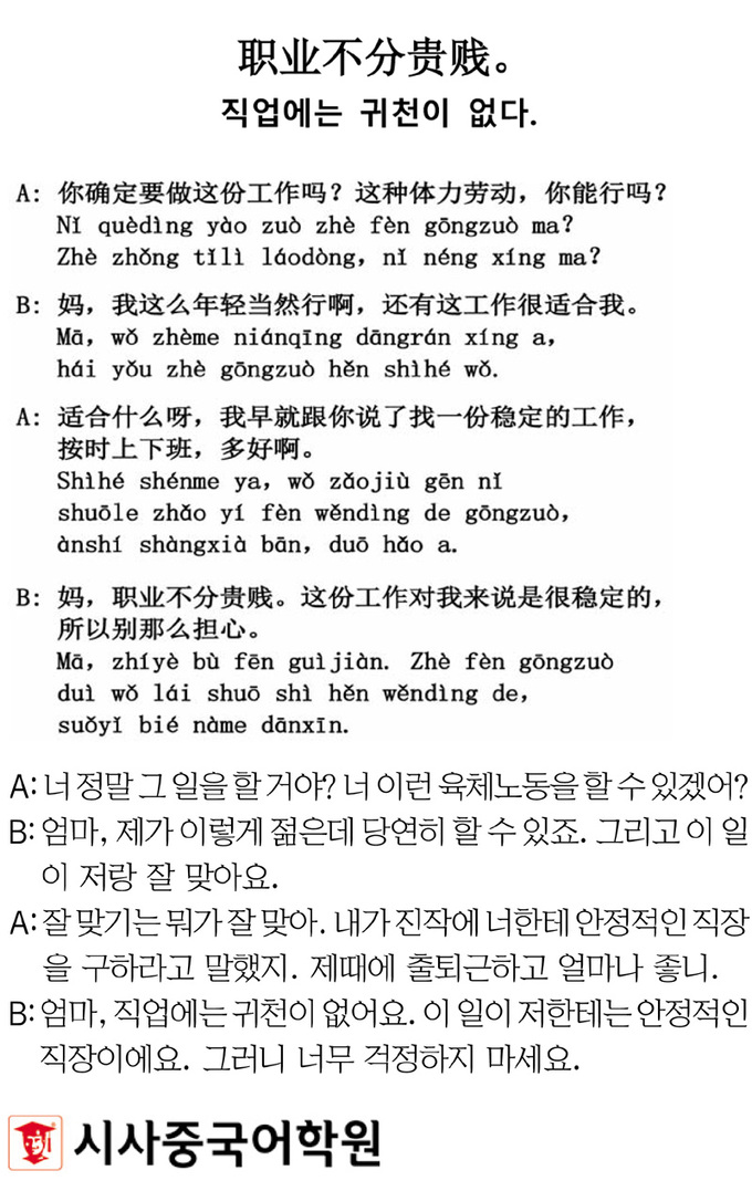[시사중국어학원의 리얼 중국어 회화] 직업에는 귀천이 없다. 입력 : 2023-01-29 18:58:05 수정 : 2023-01-29 18:58:05 구글 네이버 유튜브 Copyright ⓒ 세계일보. 무단 전재 및 재배포 금지 세계일보