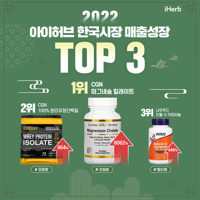 아이허브에 따르면 2022년 한국 시장 매출 성장률 1위는 아이허브의 대표 PB인 ‘캘리포니아 골드 뉴트리션(California Gold Nutrition, CGN)’의 마그네슘 킬레이트’이다. 이 제품의 매출은 작년 한 해 동안 6062% 상승했다. 이어 ‘CGN 100% 분리유청단백질’이 464%, 나우푸드(Now Foods) 항산화 성분 영양제 ‘인돌-3-카르비놀’ 200mg 제품의 매출 신장률이 446%로 각각 2위와 3위에 올랐다.