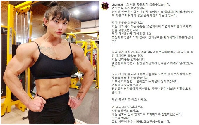 보디빌더 춘리가 자신의 신체 특성 부위를 확대해 평가한 악성 게시글에 대해 “제가 무엇을 잘못했나”라며 분노했다.