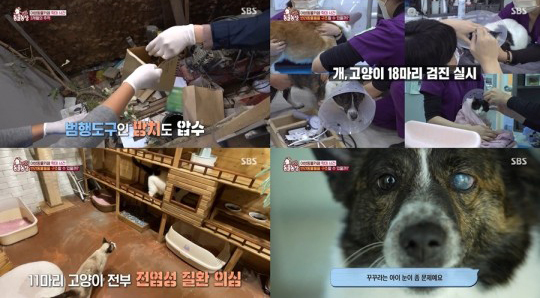 병원 검진 결과는 11마리 고양이 모두 전염성 질환이 의심되고, 개들은 초고도 비만 및 양육상태 부실이라는 결과가 나왔다.