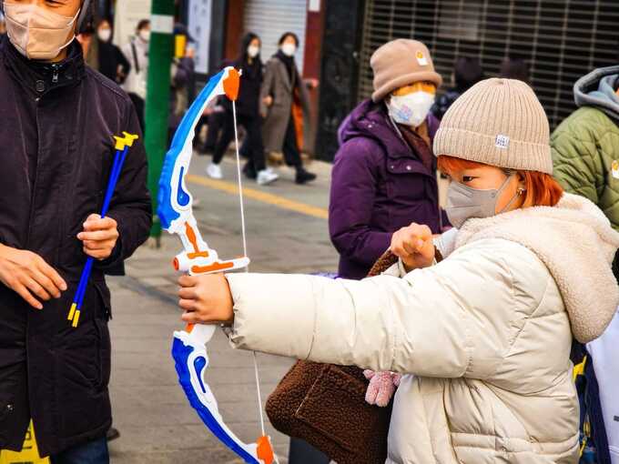 해당 부스에는 윤 대통령 부부와 한 장관의 얼굴 사진을 붙인 인형이 있었고 퇴진 집회에 참석한 이들은 장난감 활을 쏠 수 있었다.