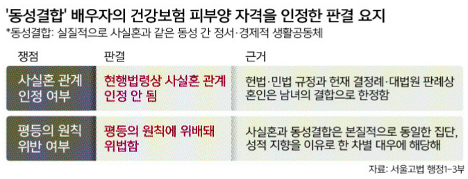 재판부는 ‘동성결합’이 피부양자 자격이 인정되는 사실혼과 본질적인 차이가 없다고 봤다. 동성결합 역시 ‘동거·부양·협조·정조 의무에 대한 상호 간 의사의 합치 및 사실혼과 동일한 정도로 밀접한 정서적·경제적 생활공동체 관계’를 전제로 한다는 이유에서다.