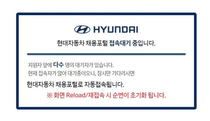 10년 만의 현대차 생산직 채용 소식에 홈페이지는 마비됐다. 현재 현대차 채용 홈페이지를 들어가면 “지원자 앞에 다수 명의 대기자가 있다. 현대 접속자가 많아 대기 중”이라며 “잠시만 기다리시면 현대자동차 채용 포털로 자동 접속된다”는 안내 메시지가 뜬다.