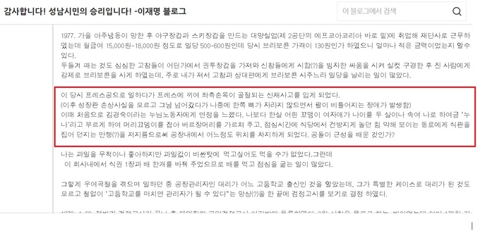 2006년 1월21일 블로그에 실린 당시 글에서 이 대표는 어려웠던 시절 이야기와 함께 경북 안동에서 성남으로 이사 온 일들을 소개하고, 프레스공으로 일하던 중 기계에 끼여 왼쪽 손목이 골절당하는 사고를 입었다고 언급했다.