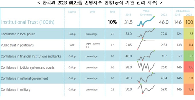 우리나라는 공적 기관에 대한 신뢰 지수도 낮았다. 공적 기관에 대한 신뢰 순위는 조사대상 167개국 중 100위를 기록했다고 한경연은 전했다. 세부 항목별로 살펴보면 사법 시스템은 155위, 군은 132위, 정치인은 114위, 정부는 111위 등 모두 하위권이었다.