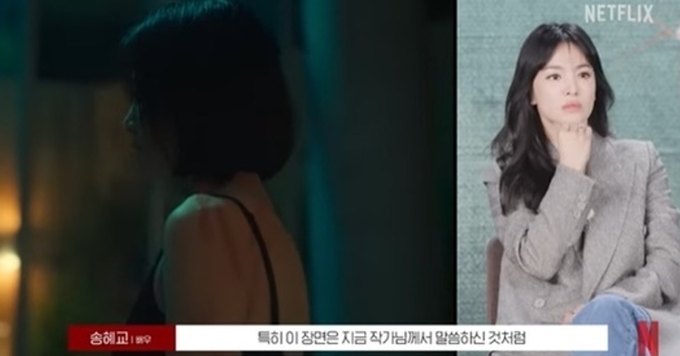 송혜교는 8일 진행된 '더 글로리' 관객과의 대화에 참석해 시즌1 6화에 등장한 노출신을 떠올리며 가장 신경을 많이 썼던 촬영으로 꼽았다. 해당 회차에서는 문동은이 주여정(이도현 분)에게 온몸 가득한 흉터를 보여주는 장면이 그려졌다.