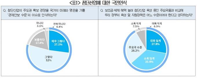 전세계 각국이 반도체와 전기차, 배터리 등 첨단산업에 천문학적인 자금을 쏟아붓고 있는 가운데, 국민 10명 중 8명은 첨단산업 육성 문제를 경제안보 수준의 이슈로 인식하는 것으로 조사됐다. 첨단산업에 대한 정부 지원 확대에 대해선 10명 중 6명이 공감했지만, 4명은 지원 확대에 신중해야 한다는 입장이었다.