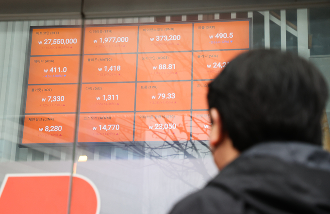 미국 실리콘밸리은행(SVB) 파산 소식이 전해지면서 국내 시장에서 비트코인을 비롯한 주요 가상화폐 가격이 하락세를 나타내고 있다. 12일 서울 서초구 빗썸고객센터 모니터에 가상화폐 실시간 거래 가격이 표시되고 있다. 연합뉴스