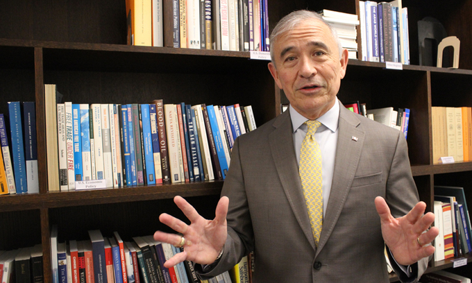 해리 해리스 전 주한미국대사가 9일(현지시간) 미국 워싱턴 싱크탱크 한미경제연구소(KEI)에서 가진 세계일보와의 인터뷰에서 한·미·일 3국 간 협력 필요성에 대해 강조하고 있다.