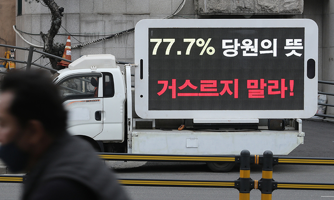 이날 정치권에 따르면 국회 앞 도로와 강병원·윤영찬·이원욱·전해철 등 비명계로 분류되는 의원들의 지역구 사무실 인근에 LED 전광판이 설치된 2.5t 및 1t 트럭이 등장했다. 전광판에서는 '국민들은 이재명을 믿는다. 당 대표 흔들기 그만하라', '77.7% 당원의 뜻 거스르지 말라' 등의 문구가 등장했다.