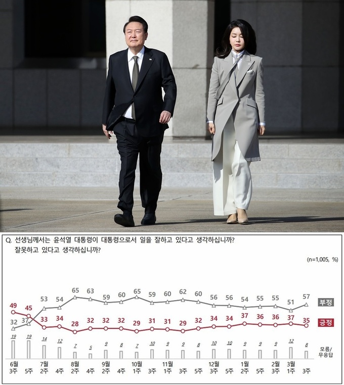엠브레인퍼블릭, 케이스탯리서치, 코리아리서치, 한국리서치가 3월13일부터 3월15일까지 만 18세 이상 남녀 1005명을 대상으로 진행한 전국지표조사(NBS) 결과에 따르면 윤 대통령의 국정운영에 대해 '잘하고 있다'라는 긍정적 평가는 35%로 나타났다. 2주 전 실시한 직전 조사 대비 2%포인트(p) 떨어졌다.