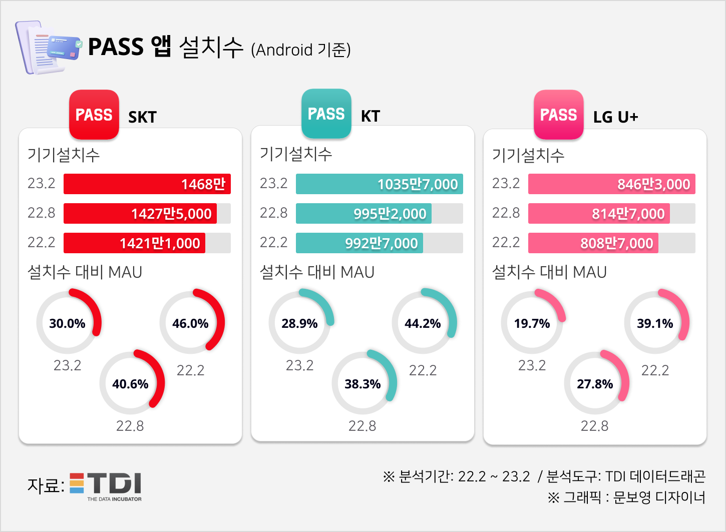빅데이터 전문 기업 TDI(티디아이·대표 신성균)가 자사의 분석 플랫폼 데이터드래곤을 통해 안드로이드 사용자가 설치한 이동통신 3사의 ‘패스’(PASS) 애플리케이션 기기 설치 수와 기기 설치 수 대비 MAU(사용자 수)를 분석해 봤다.