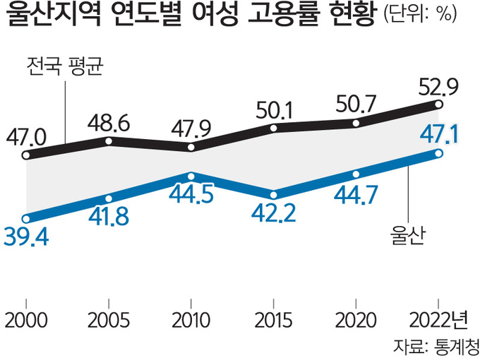 울산의 여성 고용률은 2011년을 제외하고 2000년부터 지난해까지 줄곧 전국에서 가장 낮았다. 2000년 울산지역 여성 고용률은 39.4%였고, 2005년 41.8%, 2010년 44.5%, 2015년 42.2%였다.