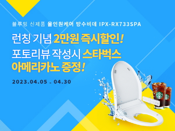 불루밍 관계자는 “IPX-RX733SPA 와디즈 펀딩에 보내주신 성원에 보답하고자 공식몰에서도 할인 및 리뷰 이벤트를 기획하게 되었다”며 “블루밍 비데의 핵심 기술이 탑재된 제품인 만큼 여러 소비자들이 만족할 것으로 기대한다”고 밝혔다.