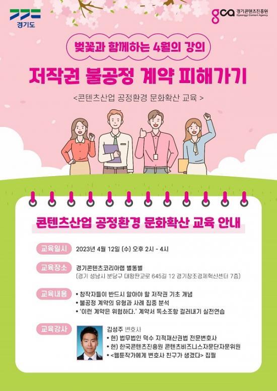 경기도와 경기콘텐츠진흥원이 4월 12일 콘텐츠 산업 종사자를 대상으로 ‘콘텐츠산업 공정환경 문화확산 교육’을 진행한다고 밝혔다.