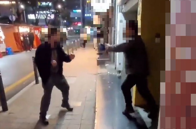 영상에서 남성 2명은 주점과 식당 등이 다수 있는 어느 길거리에서 술에 취한 듯 몸을 다소 비틀거리며 주먹을 쥔 채 서로를 노려보고 있었다.