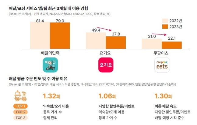 배달의민족은 최근 3개월 내 이용 경험이 작년 조사에서 81.4%였다가 올해 79%로 2.4%포인트만 줄었으나, 2위 요기요(운영사 위대한상상)는 작년 49.4%에서 37.8%로 11.6%포인트 감소했다. 3위 쿠팡이츠(운영사 쿠팡)도 작년 31%에서 22.1%로 8.9%포인트 줄었다.