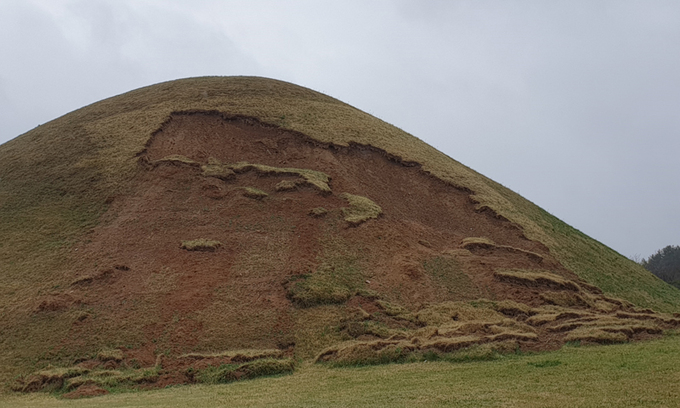 힌남노가 경주를 덮친 지 반년이 훌쩍 지났지만 그 피해는 도시 곳곳에서 여전히 쉽게 찾아볼 수 있었다. 이날 신라시대 궁궐이 있었던 자리인 월성 남쪽 사면에는 너른 잔디 사이로 파란색 방수천이 덮여 있는 모습이었다. 굴불사지석불상과 마찬가지로 힌남노로 지반이 무너져내린 자리였다. 여기서 5㎞가 채 되지 않는 곳에 있는 사적인 서악동 고분군 내 한 거대한 봉분도 힌남노로 무너진 한쪽 면이 붉은 흙더미를 드러낸 채 관광객을 맞이하고 있었다.