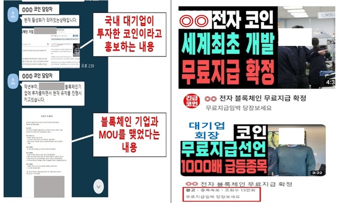 #1. A씨는 지난해 12월 한 유튜브 재테크 채널에서 “대기업이 직접 개발하고 투자한 코인”이라는 문구에 혹해 해당 가상자산에 1000만원을 투자했다. 해당 채널 관리자는 “400% 이상 고수익이 가능하다”고 홍보하면서 “원금과 고수익을 보장한다”고 강조했다. A씨는 이후 가상자산 투자금의 회수를 요청했으나 관리자는 “락업(매매금지)기간 동안 매도할 수 없다”고 출금을 차일피일 미루더니 결국 연락이 두절됐다.