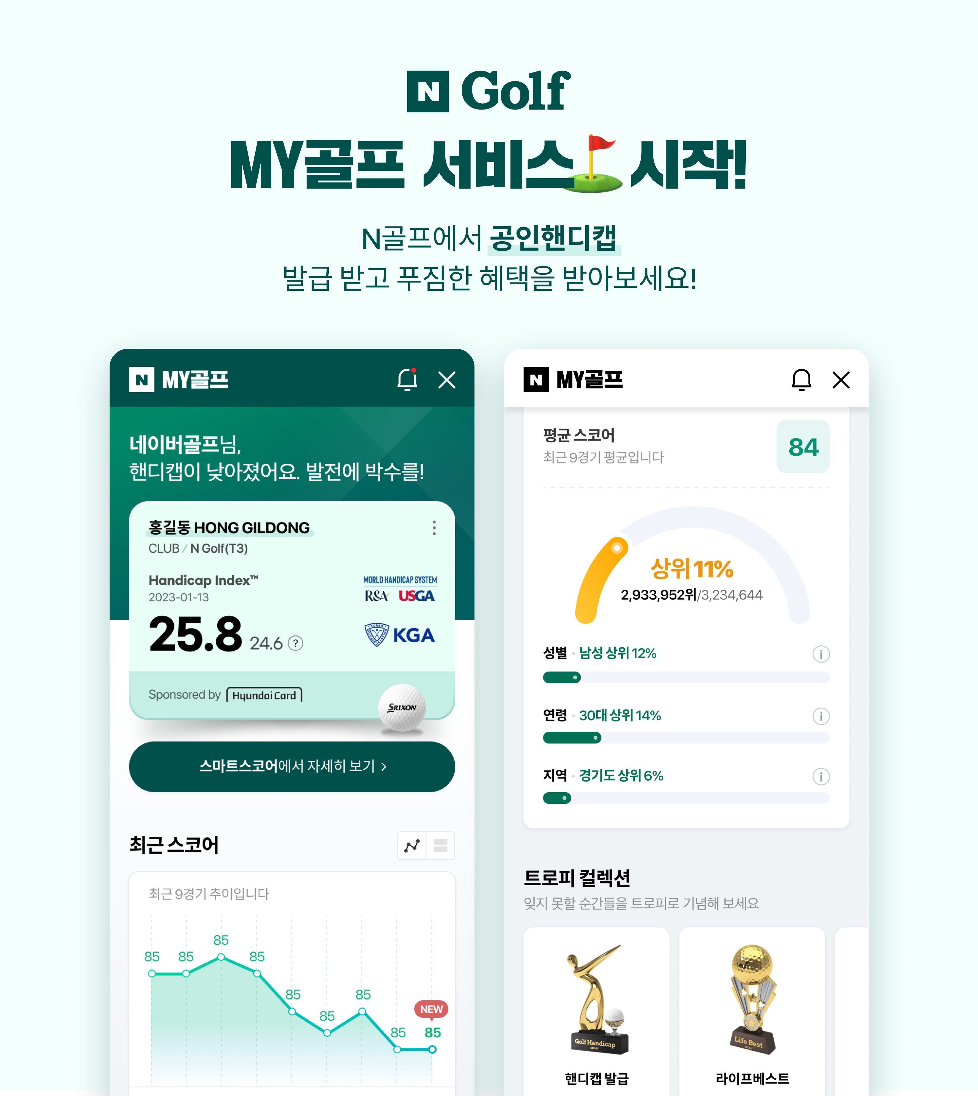 네이버 스포츠 이용자는 MY골프에서 스마트스코어 데이터 연동 후 간편하게 공인핸디캡을 발급받을 수 있다. 또한 최근 스코어, 평균 스코어, 성별/연령별/지역별 순위, 트로피 컬렉션 등을 통해 객관적 실력을 파악하고 명확한 목표를 세울 수 있으며, 일부 공인핸디캡을 요구하는 해외 골프장, 대회에서 이를 증명할 수 있다.