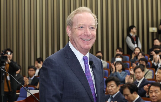 브래드 스미스 마이크로소프트 부회장이 18일 오후 서울 여의도 국회에서 'AI의 현재와 미래, 그리고 우리' 주제로 강연을 하고 있다.