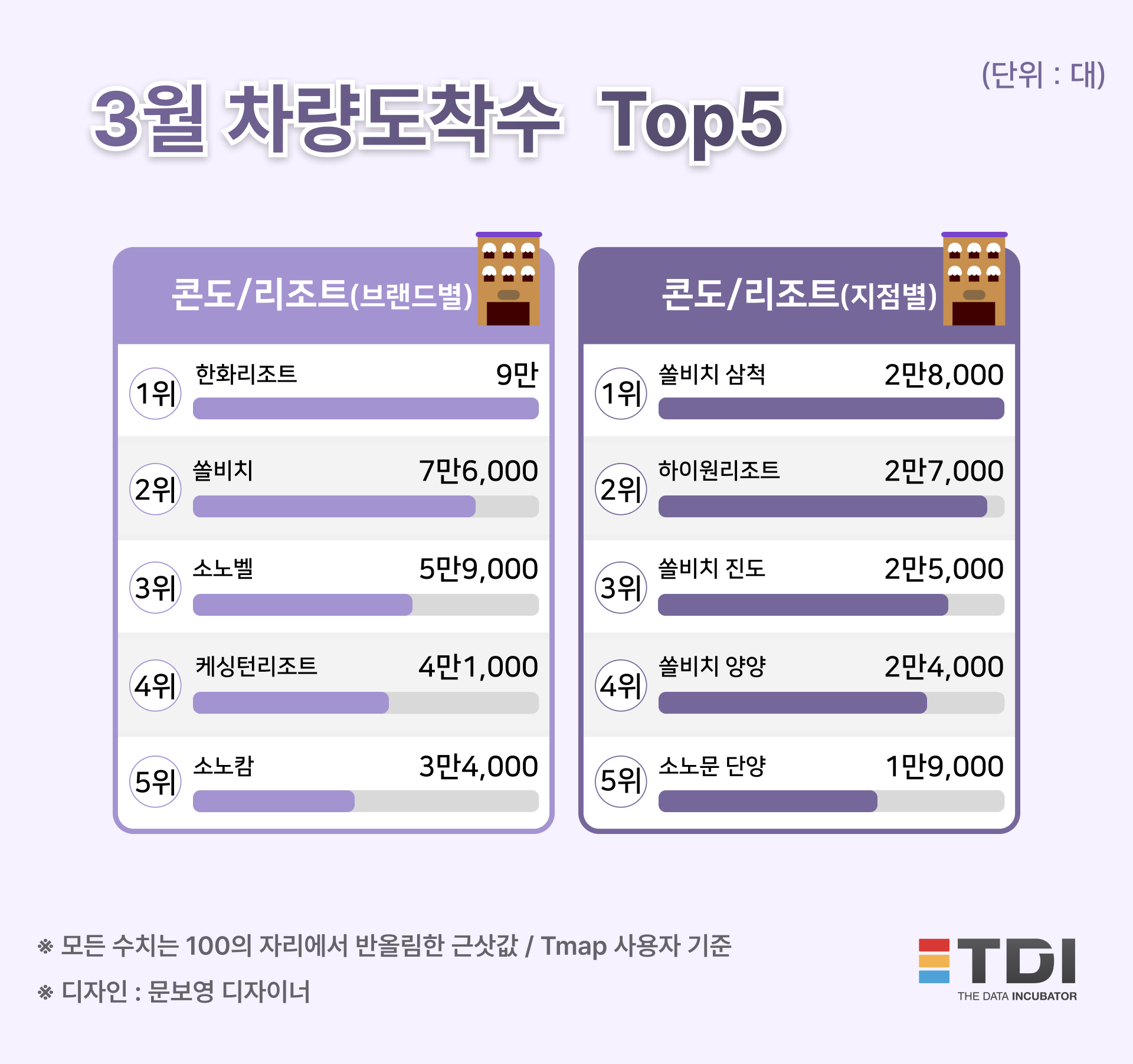 3월 기준 브랜드별 리조트 톱5는 △한화리조트(9만 대) △쏠비치(7만 6,000대) △소노벨(5만 9,000대) △케싱턴리조트(4만 1,000대) △소노캄(3만 4,000대) 순이다.