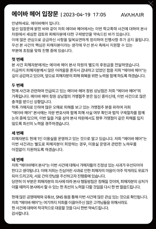 프랜차이즈 미용실 에이바헤어 본사가 일반인 표예림씨의 학교폭력 사건 피해 회복을 위한 적극적인 대응을 약속했다.