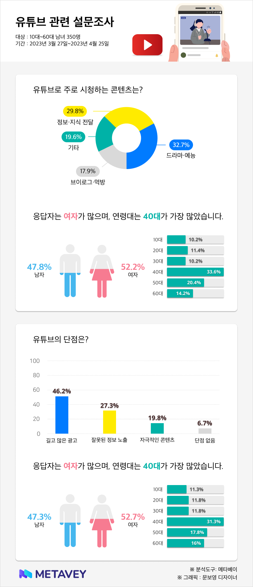 데이터 기반 리서치 기업 메타베이(Metavey)가 국내 대형 언론 매체의 구독자들을 대상으로 유튜브 관련 설문조사를 실시했다. 조사 기간은 3월 27일부터 4월 25일까지이며, 10~60대 남녀 350명이 참여했다.