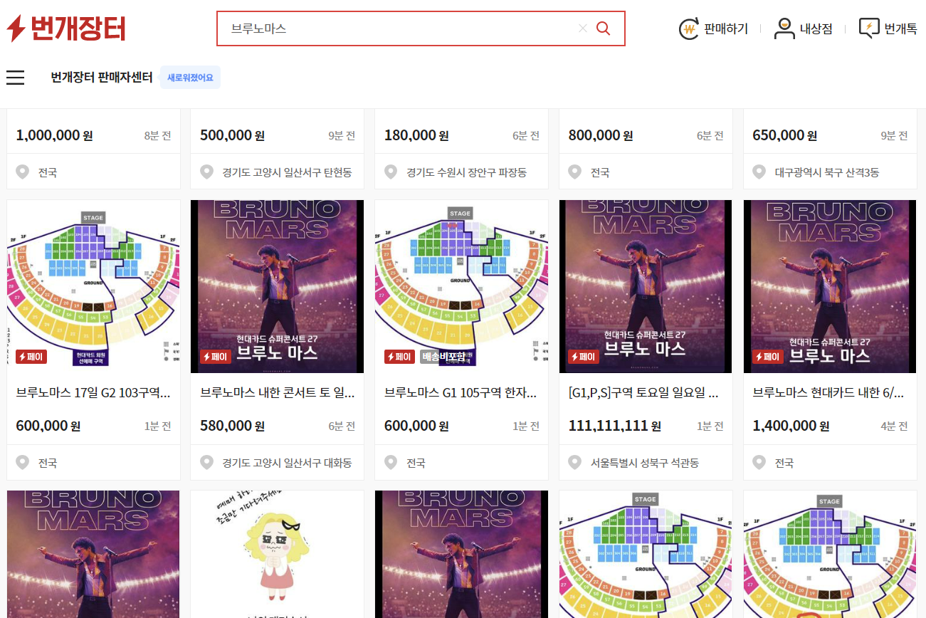 세계적인 팝스타 브루노마스의 내한 콘서트 티켓팅이 27일 낮12시에 진행된 가운데 기존 티켓 가격 2배를 제시하는 암표상들의 글이 이날 오후 부지기수로 올라왔다.