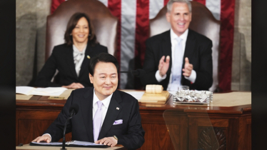 윤석열 대통령이 27일(현지시간) 워싱턴DC 연방하원 본회의장에서 상∙하원 합동연설을 한 가운데 매끄러운 영어 연설이 누리꾼 사이에 회자되고 있다.