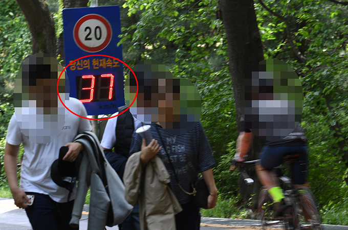 자전거를 탄 시민은 남산공원길 남산도서관 방향의 내리막길에는 자전거의 제한 속도는 시속 20㎞. 하지만 시속 40㎞는 족히 넘어 보였다. ‘자전거 사고 잦은 곳’이라고 적힌 안내 표지판이 눈에 띄지만, 아랑곳하지 않은 채 페달을 밟으면 달리는 모습을 쉽게 찾아볼 수 있다. ‘자전거 사망사고 발생구간 입니다. 속도는 줄이고 안전은 높이세요’ 라는 현수막이 곳곳에 설치 돼 있었지만, 소용없는 듯 했다.